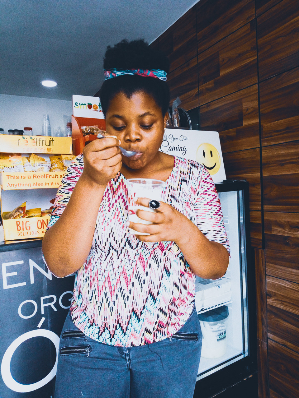 I went there with the intention of having the strawberry smoothie but I changed my mind and had the passion parfait (had kiwi, coconut, banana, yogurt and oats and some other yummy things in it).